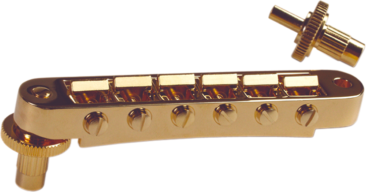 The Gibson Tune-o-matic bridge remains one of the most revered and copied pieces of guitar hardware ever developed, and the Nashville Tune-o-matic bridge offers un-notched saddles with individual saddle screw retainer clips, and a wider footing for increased intonation range. The stud and thumbwheel are also cast directly onto the bridge, allowing the Nashville Tune-o-matic to slide directly into place. This OEM part is available in either Chrome, Nickel, or Gold finish.