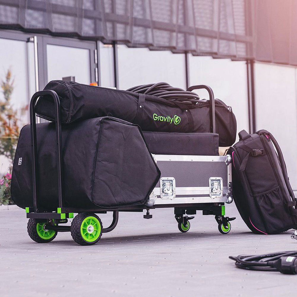 Sound technicians, DJs and stagehands: Take the weight off your load with a multi-functional cart. The Gravity Cart chassis is made of steel to ensure rigidity. Two fixed and two rotating low-rolling resistance, anti-slip rubber tyres provide extra manoeuvrability. The Gravity Cart is your trusty companion before and after every show. And the best thing is: The light-weight, compact-folded, multi-functional cart lifts easily from the tour bus while also performing effortlessly when fully loaded with equipment. With its (up to 0.98 m) extendable chassis and 150 kg load capacity, your equipment is quickly and safely transported to and from the stage. And thanks to its optimal ergonomic design: without straining your back.