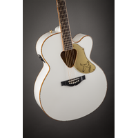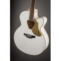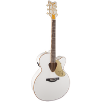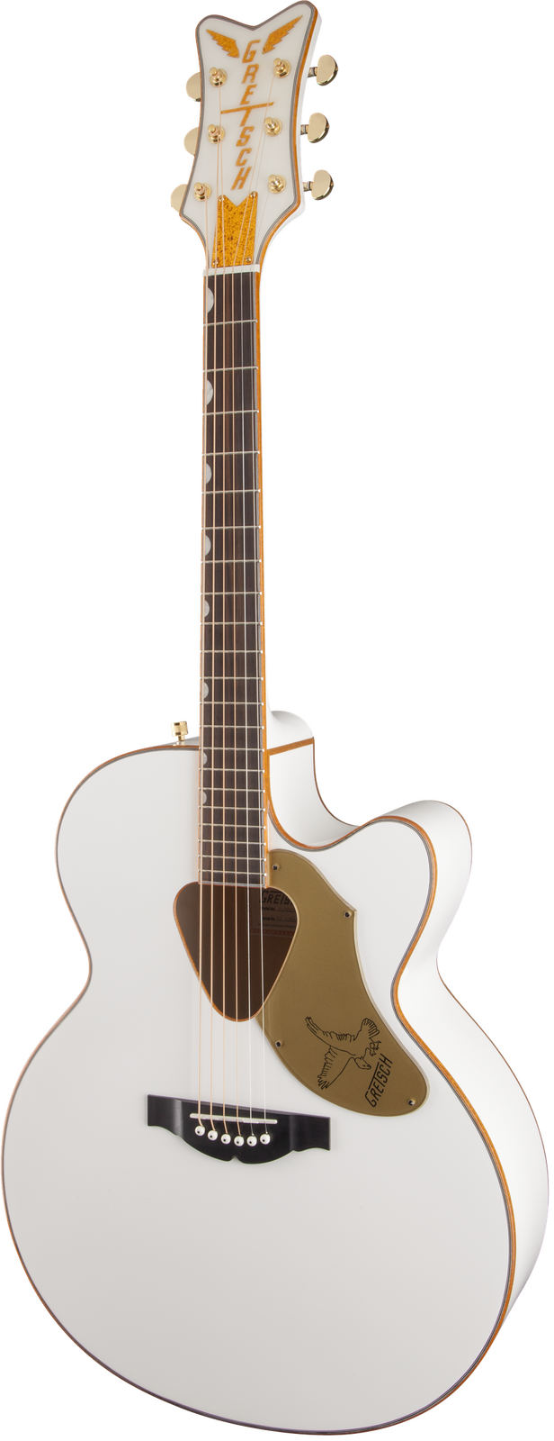 Its jumbo cutaway body includes dazzling gold-sparkle binding on the top, back, sound hole, fingerboard and headstock. Other premium features include a solid spruce top with scalloped "X"-bracing and classic Rancher triangular sound hole, maple sides and arched back, mahogany neck, 21-fret laurel fingerboard with Neo-Classic™ thumbnail inlays, "V"-shaped headstock with vertical winged "Gretsch" sparkle logo, compensated bridge with laurel base, deluxe tuners and gold-plated hardware.