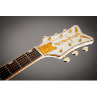 Unique Features: V-Shaped Matching White Painted Falcon Headstock with Gold-Sparkle Inlaid Gretsch Vertical Winged Logo, Traditional Gretsch Rancher "Triangular" Sound Hole, Gold Sparkle Bound Body Neck and Headstock with B/W/B/W Purfling, Gold Sparkle Heel Cap, Synthetic Bone Nut, Knurled Strap Retainer Knobs, Adjustable Truss Rod with Headstock Adjustment