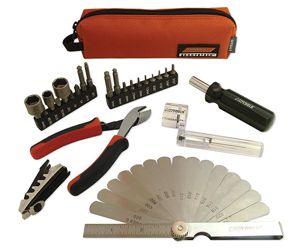 Our GrooveTech series kits are the ultimate for guitar and bass players, but weren't designed to be very portable. The Stagehand kit addresses this, with no loss in capability and at a modest price to boot! Central to the concept is a 19-piece magnetic bit set and screwdriver-style bit holder, with both inch and metric hex wrenches, screwdrivers, and sockets to handle virtually any make and model of guitar or bass. A capo and 15-blade thickness gauge with integrated ruler permit neck measurement, which is essential to proper truss rod adjustment. Also included are downsized string cutters and a string winder. Everything fits into an uber-compact pouch that is ready to hit the road.