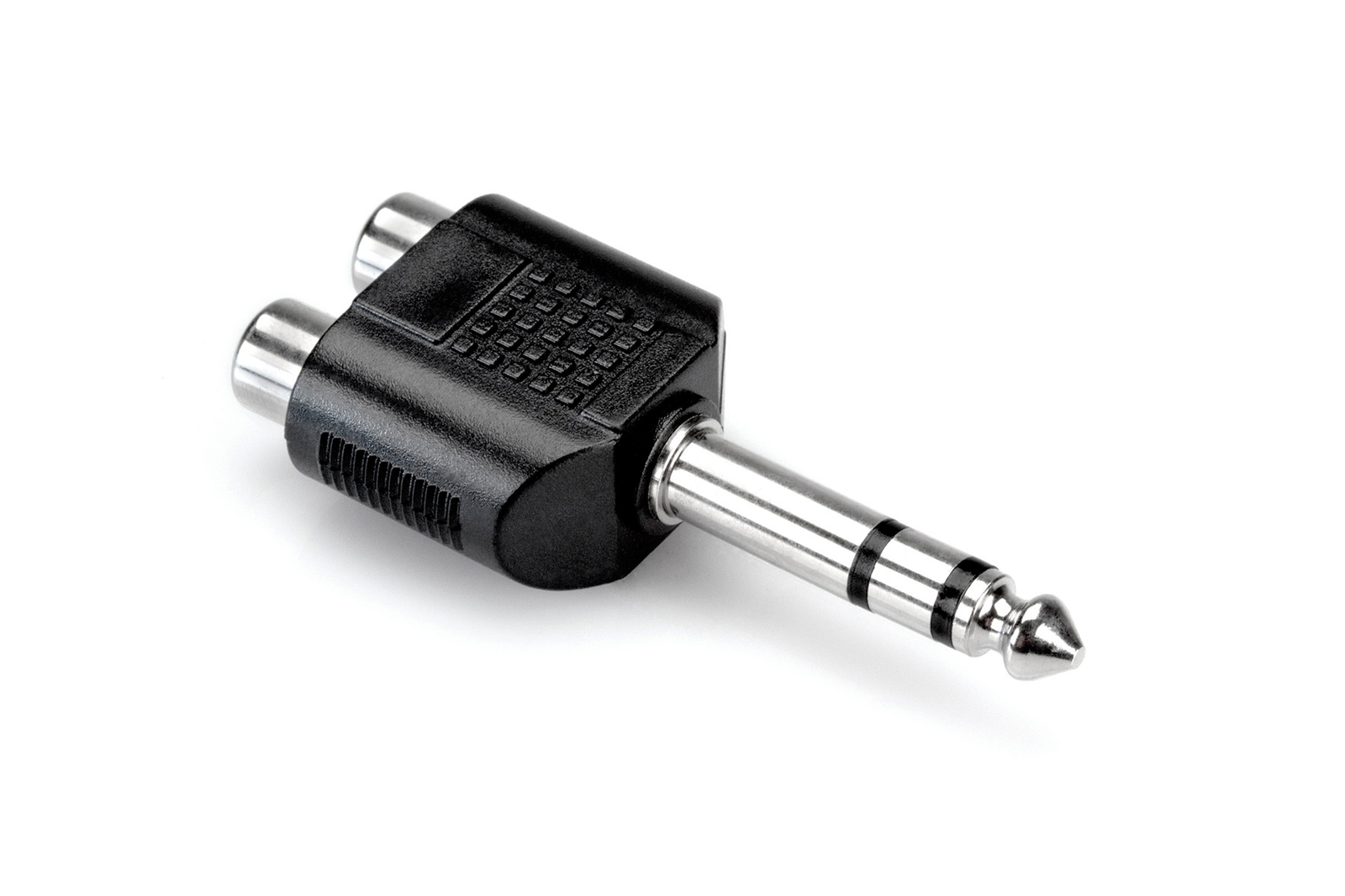 This adapter is designed to adapt a stereo cable with phono plugs to a stereo phone jack.