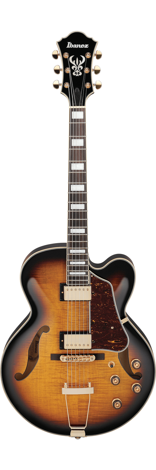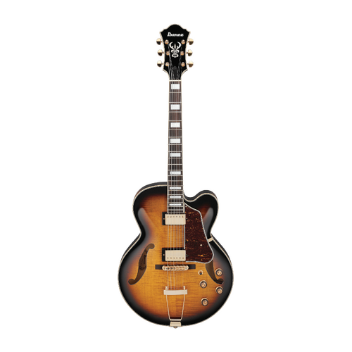 An expertly crafted 3pc Maple/ Mahogany set-in neck ensures body liveliness and is fitted with a rich Ebony fretboard with silky contrasting pearl block inlays. The tortoise shell colored pickguard provides an gorgeous appearance.Jazz fans will recognize the Ibanez original Super 58 Custom pickups—the preferred pickup of George Benson, Pat Metheny, and John Scofield used in their own signature models. These pickups provide warm, balanced articulation, and excellent response. Super 58s are at home in variety of genres.
