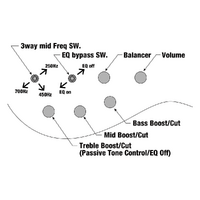 The 3-way Mid frequency switch allow players to change the mid-tone between 250, 450, and 700 Hz.