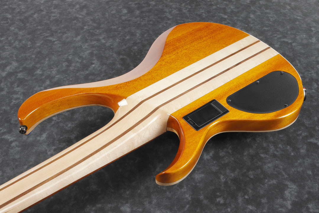 Ibanez is pleased to introduce the BTB845 to the Standard BTB line. The BTB845's sleek body has a curved bevel that helps create a more elegant feel with beautiful figuring, swirls and darker pockets of Poplar Burl body top. The Ash and Okoume winged body feature a warm tone with rich resonance and superior sonic attack. The MR5 bridge allows a wide intonation adjustment range, and each isolated bridge works for maximum vibration transfer without interference. The Ibanez Custom Electronics 3-band EQ and 3-way midfrequency switch allow for precise tonal control (250 Hz, 450 Hz, and 700 Hz). The Bartolini® BH2 dual-coil pickups with a rich low frequency provide a balanced, warm response with a tight bottom end and full midrange. The BTB845 comes strung with D’Addario® NYXL strings for a large dynamic range and sensitive harmonic response. The deep cutaway of the lower horn allows effortless access to higher frets and the 18th fret neck joint of the upper horn provides tonal sustain and neck stability. The BTB’s 35-inch through-neck is constructed with 5 pieces of Maple and Walnut, providing massive sustain and excellent stability. Moreover, the neck end adjustment allows you to adjust the neck easily. The extended scale length helps create a clear sound and sufficient string tension for the lower strings while adding ringing sustain to the upper strings. Other features include the secure, high-tech Neutrik® locking output jack.
