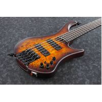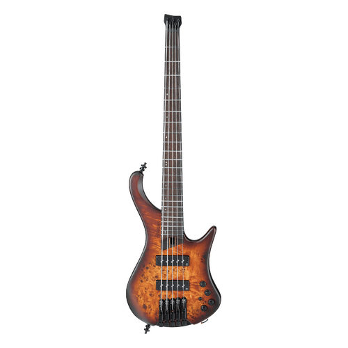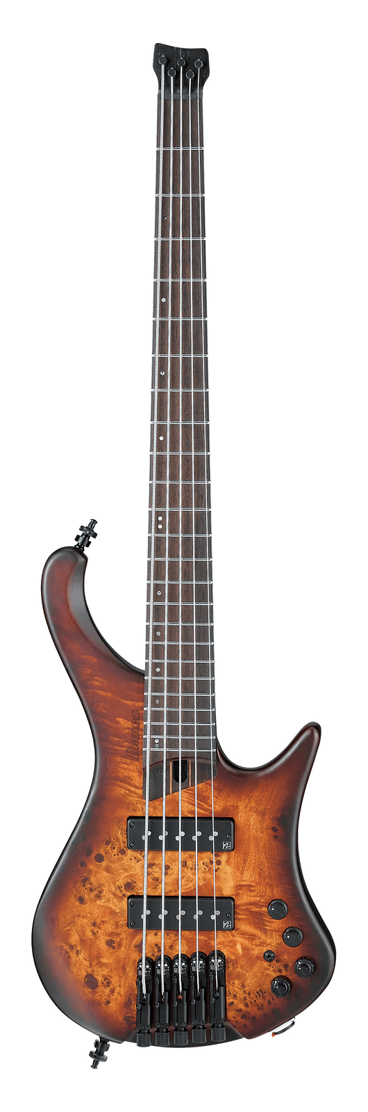 For more than 40 years, Ibanez has pioneered new frontiers in bass development, pushing the boundaries of conventional designs to bass players of all styles and aptitude new ways of expressing themselves. This spirit of exploration has led to the creation of some of the most successful and popular production basses of all time. Utilizing experience and knowledge up until now, Ibanez has developed ultimate ergonomic basses, the EHB basses, which feature the deeply considered headless design. The EHB’s headless construction and specially designed body enable the player to maintain a similar playing position whether seated or standing. Its contoured, ergonomic design and chambered body make for a lightweight, well-balanced, and comfortable instrument that’s excellent for long sets or practice session. There is extra carving on the back of the body behind the lower horn for easier upper fret access. Also, the top half of the back of the body is slanted which allows the bass to rest slight closer to the player’s body for better control and a more ergonomic feel. The EHB1505 features a stunning Poplar Burl top and an African Mahogany body for a warm tone with rich resonance. The 9-piece Panga Panga/Walnut neck provides superior note attack, tight lows and increased sustain with the Panga Panga fretboard. Highly durable stainless steel frets accentuate tonal brightness and will not rust. Luminescent side dot inlays provide clear visibility in dark environments and the truss rod adjustment is located at the end of neck for easy access. The single-coil Nordstrand™ Big Split pickups feature split coils with hum cancelling construction for less noise. Its tone character is a hybrid P/J style and provides a rich and strong, yet well-balanced tone, which fits well with various kinds of playing styles. The Vari-mid 3-band EQ features a variable mid-frequency control which allows you to dial in an incredibly wide range of sounds. There is also an EQ bypass switch for passive operation with the treble control acting as a passive tone control when the EQ is bypassed. The MR5HS bridge is designed especially for the EHB basses and features wide intonation range. Each bridge piece is independently and securely attached to the body for maximum vibration transfer, and the saddles are adjustable for string spacing +/-1.5mm, answering every bassist’s individual string spacing demands, no matter what playing style. Teflon washers are used on each tuner for a smooth tuning action. Schaller S-Lock strap lock pins and a Neutrik locking jack hold the strap and cable securely, and a detachable finger ramp and a gig bag are included with each instrument.