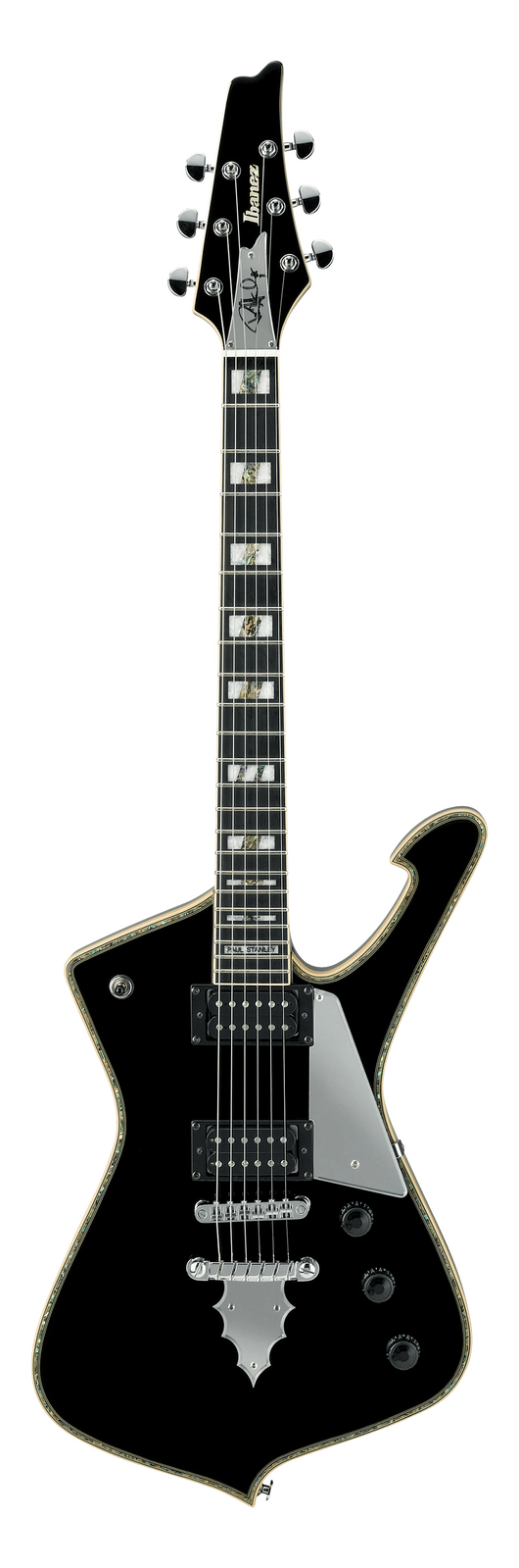The Ibanez PS120 BK Paul Stanley Signature part of the Ibanez Signature Series. With a 3pc Mahogany set-in neck a 628mm/24.7 scale, and Bound Ebony fretboard w/Acrylic & Abalone block inlay and, Full Tune III bridge.