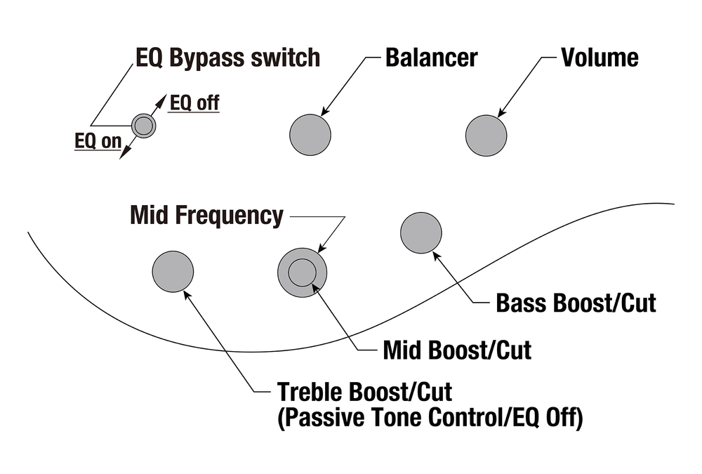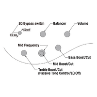 The EQ bypass control offers precision tonal adjustments, including a switch to choose passive-only operation. When the EQ bypass is activated, the treble tone control knob becomes the global tone control for the passive circuit.