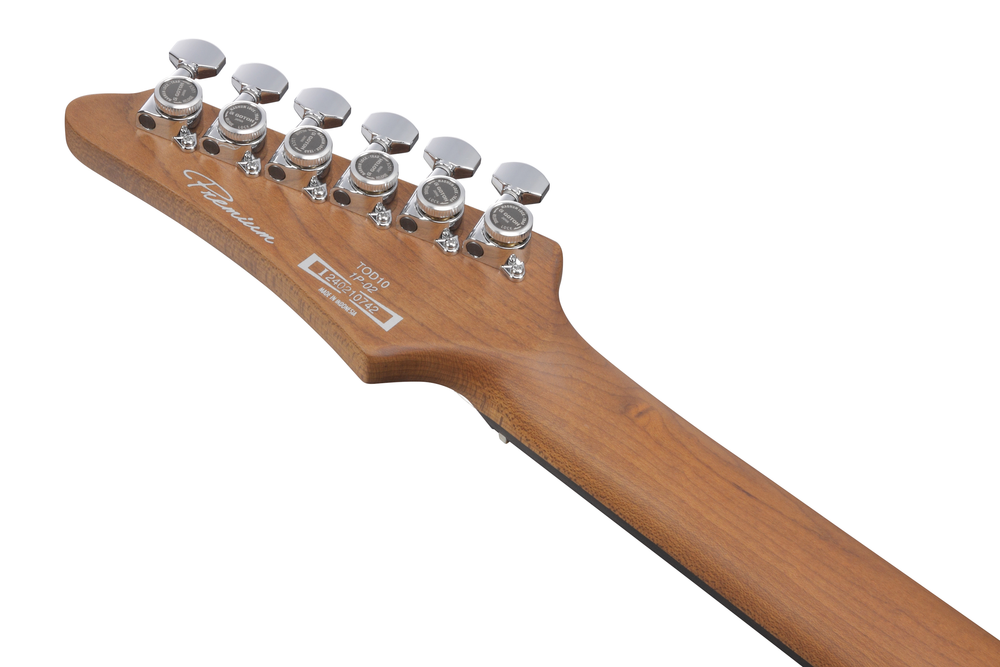 The Ibanez Tim Henson TOD10 reflects Tim's highly versatile playing style. The TOD10’s most striking aesthetic feature may be the finger board inlay design which Tim has dubbed the "Tree of Death". A twist on the iconic Ibanez "Tree of Life". The Ibanez TOD10 features an AZ oval C roasted maple neck, American basswood body and Tim Henson signature Fishman Fluence pickups.