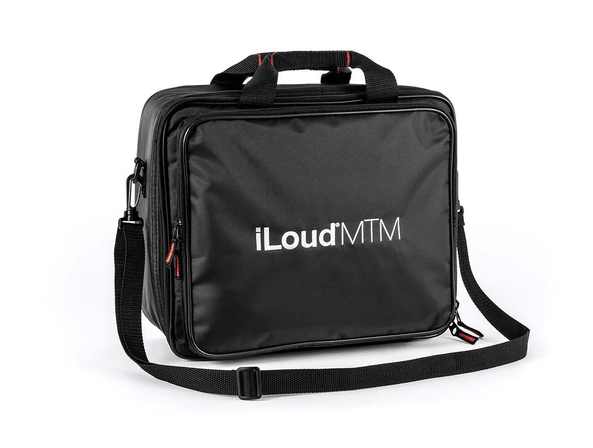 A gig bag for iLoud MTM with adjustable straps and a zippered pouch. Accommodates 2 monitors. Color: Black.