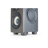 The ISO-PUCK upper flange “suction cup” design adheres to the underside of the cabinet making the upper isolator live with the speaker, while the lower isolator anchors to the supporting surface. All the energy is managed within the core of the ISO-PUCK isolators which are carefully tuned to provide superior isolation and control while remaining on-axis.