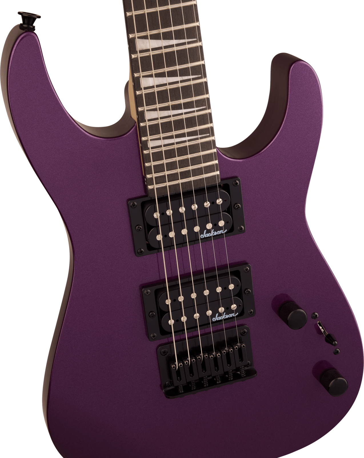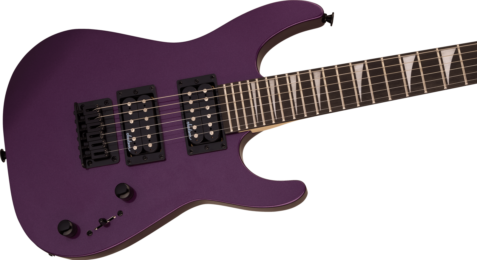 A pair of Jackson high-output humbucking pickups with ceramic magnets crank out clear tone with plenty of girth. The neck position delivers bright highs while the bridge adds plenty of crunchy distortion. Its versatile voice can be shaped with a three-way toggle switch and single volume and tone controls, while a string-through-body hardtail bridge with block saddles improves intonation and sustain.