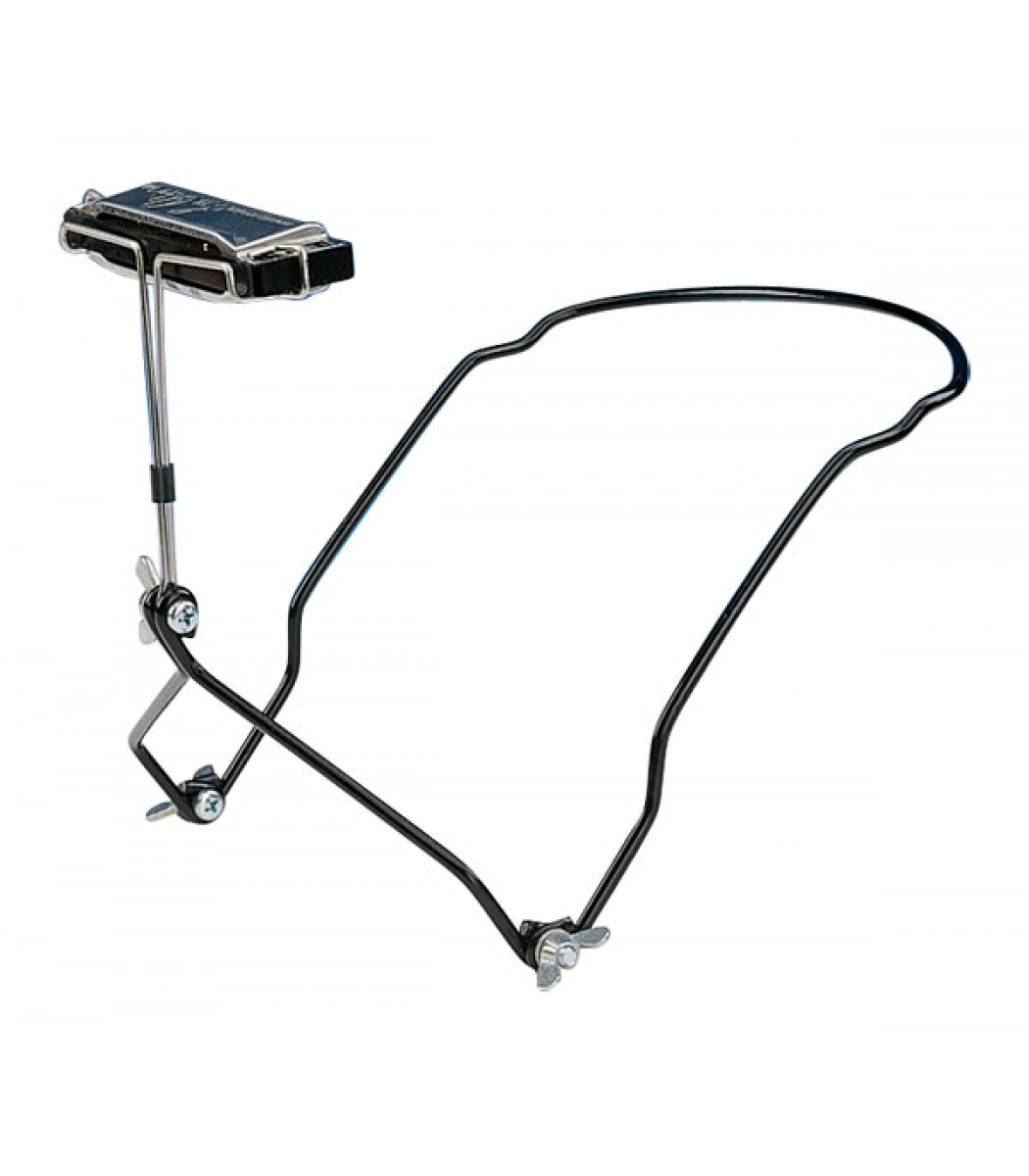 Lightweight harmonica holder featuring a stainless steel holding clip and comfortably contoured harness. The holding clip fits all 10 to 14 hole harmonicas. This design allows for height & angle adjustments.