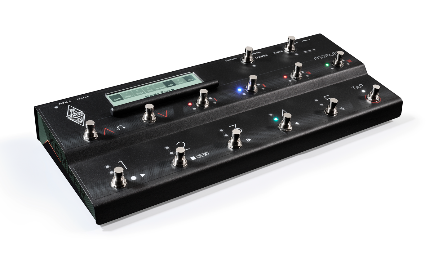 Five buttons allow you to directly access five different sounds ("Rigs") and entire Performances can be switched using a bank system. Dedicated buttons let you access the tuner, tap in the tempo, and enable the looper effect.