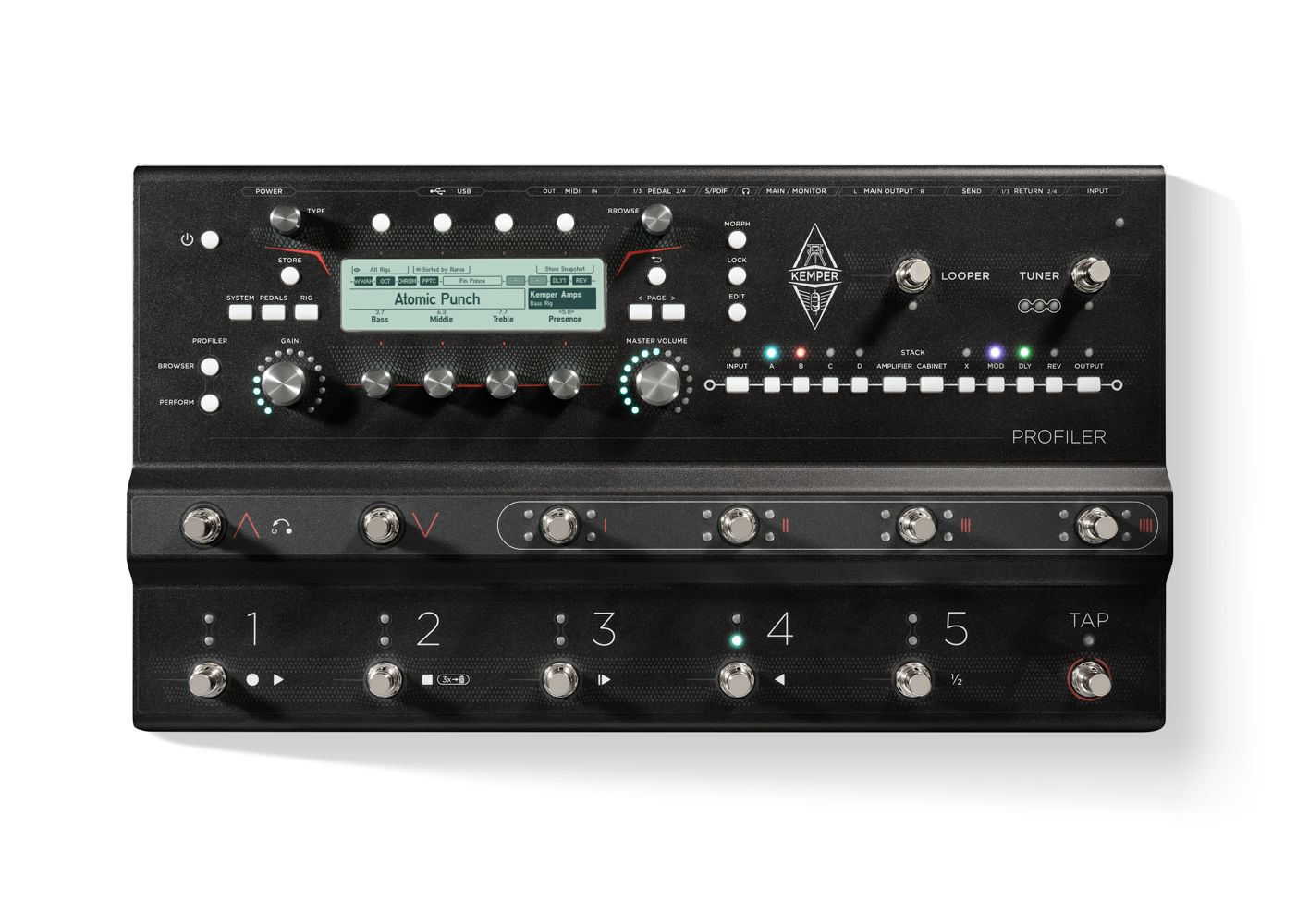 Dedicated buttons control Tuner Mode and Looper, as well as trigger Tap Tempo or other assignable functions.