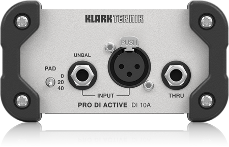 Building on KLARK TEKNIK’s storied legacy of highest-quality direct injection devices, the DI 10A PRO DI ACTIVE offers the same high headroom, dynamic response and sonic clarity you have come to expect. DI 10A is ideal for interfacing keyboards, samplers and other electronic musical instruments to mixing consoles, and faithfully reproduces the character of electric and acoustic instruments, allowing far more of the detail of musical performances to be captured. The DI 10A is powered by +48 V phantom power with a 9 V battery backup, which automatically allows the device to function should phantom power fail, or be unavailable. Equipped with a switchable input attenuator, DI 10A easily accommodates instruments, line, and even loudspeaker level signals – and thanks to its extremely low noise input circuit topology (-112 dBu), DI 10A provides extended dynamic range, making it the perfect choice for professional audio and multimedia applications.