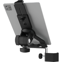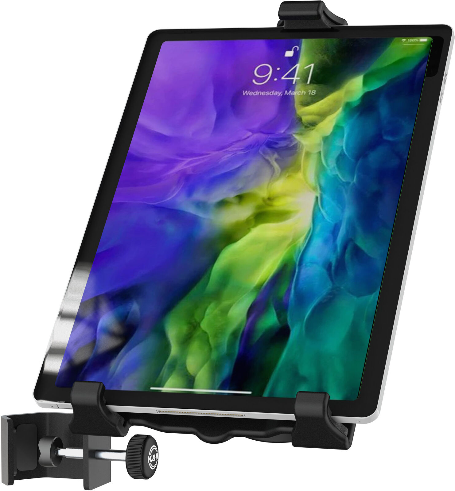 Universal tablet holder with a convenient clamping mechanism for tablets ranging in size from approx. 10" to 16" in horizontal - and approx. 7" to 13" in vertical position. The clamping range of the tablet PC holder is between 155 and 307 mm. The tablet holder is made of bio-based plastic. These plastics contain a proportion of over 50% up to 100% of renewable vegetable raw materials. The use of renewable raw materials helps to conserve limited petroleum resources and reduce harmful CO2 emissions. More information on bio-based plastics at: bioplastic.k-m.de. The holder is also particularly suitable for tablets with a protective cover or case up to 18 mm thick. The overlapping clamping jaws with integrated rubber pad guarantee a secure hold and eliminate unwanted vibration noise. The function of the operating elements on the device and the taplet pencil (portrait format only) are not impaired. The holder can be swivelled and tilted, allowing each user to position it individually. The swivel movement can be adjusted from easy to tight by means of a clamping screw. The holding arm with clamping element is suitable for clamping to tube diameters up to 30 mm.