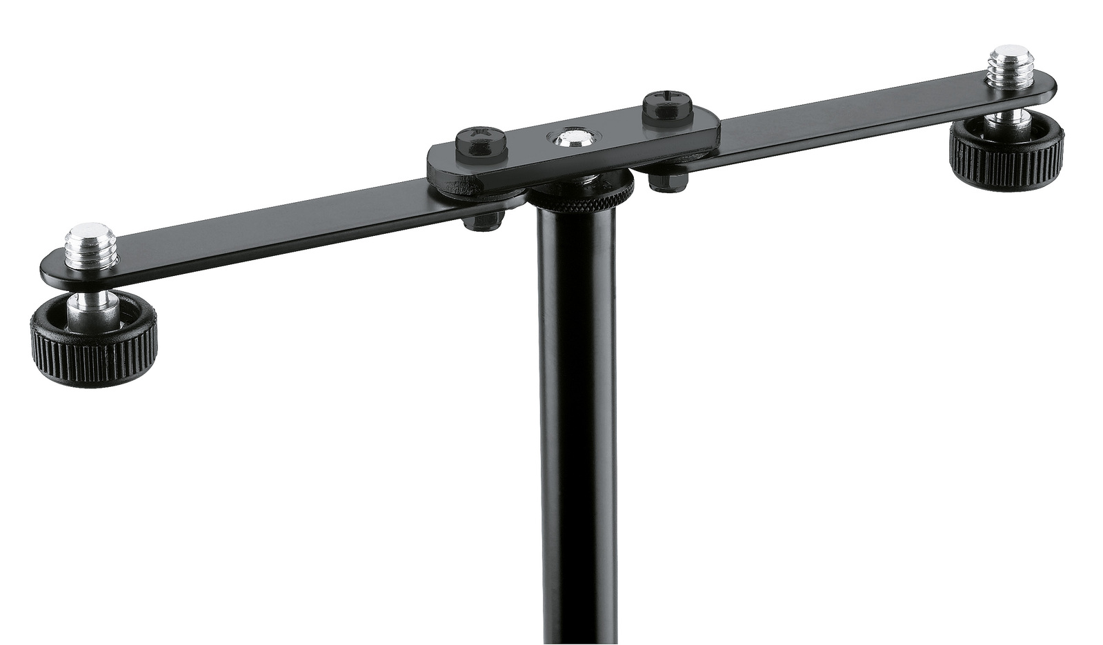 The flexible microphone bar for microphone stands. Two moveable bars position the microphone where ever you would like it. Each bar is fitted with a captive knurled screw. The entire bar can be screwed onto all standard microphone stands with a 5/8" threaded connector.