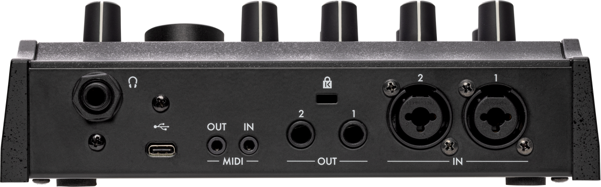Jacks and Ports: IN 1, 2 jacks (XLR/6.3 mm TRS monaural phone jack), OUT 1, 2 jacks (6.3 mm TRS monaural phone jacks), MIDI IN jack, MIDI OUT jack (3.5 mm TRS phone jack), (USB) port (Type-C), (headphones) jack (6.3 mm stereo phone jack)