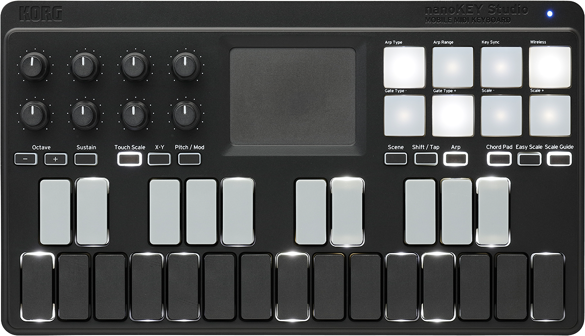 Controller: 25-key Keyboard with velocity sensitivity (four velocity curve), 8 trigger pad (velocity sensitivity is supported, four velocity curve), 8 knobs, X-Y pad, Octave + / - buttons, Sustain button, Touch Scale button, X-Y button, Pitch / Mod button, Scene button, Shift / Tap buttons, Arp button, Chord Pad button, Easy Scale button, Scale Guide button