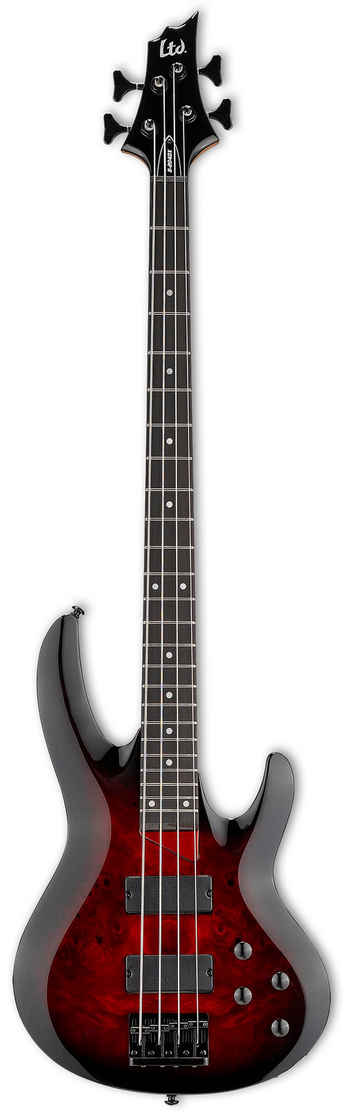 The LTD B-204DX is a bass that delivers far more than anyone would expect, given its modest price. Built with bolt-on construction at 34” scale, the B-204DX offers a poplar body with an outstanding burled poplar top, where the wood’s natural knots and figured grain provide an eye-catching aesthetic. This bass also offers a smooth and comfortable roasted maple neck and a rosewood fingerboard with dot inlays and 24 extra-jumbo frets. Components on the B-204DX include black hardware, LTD tuners, an LTD DB-4 fixed bridge, controls for volume, balance, treble and bass EQ, and a set of excellent ESP SB-4 bridge and neck pickups.