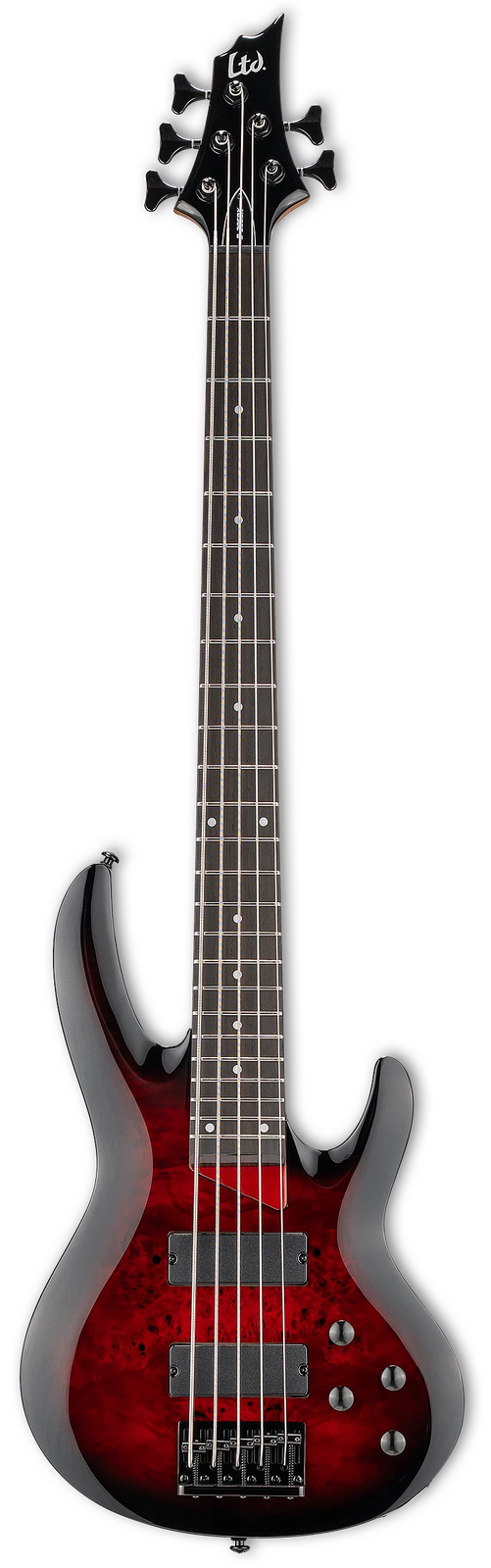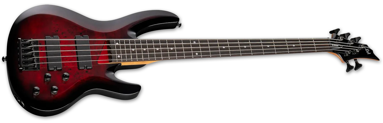 The LTD B-205DX is a 5-string bass that delivers far more than anyone would expect, given its modest price. Built with bolt-on construction at 34” scale, the B-204DX offers a poplar body with an outstanding burled poplar top, where the wood’s natural knots and figured grain provide an eye-catching aesthetic. This bass also offers a smooth and comfortable roasted maple neck and a rosewood fingerboard with dot inlays and 24 extra-jumbo frets. Components on the B-204DX include black hardware, LTD tuners, an LTD DB-5 fixed bridge, controls for volume, balance, treble and bass EQ, and a set of excellent ESP SB-5 bridge and neck pickups.