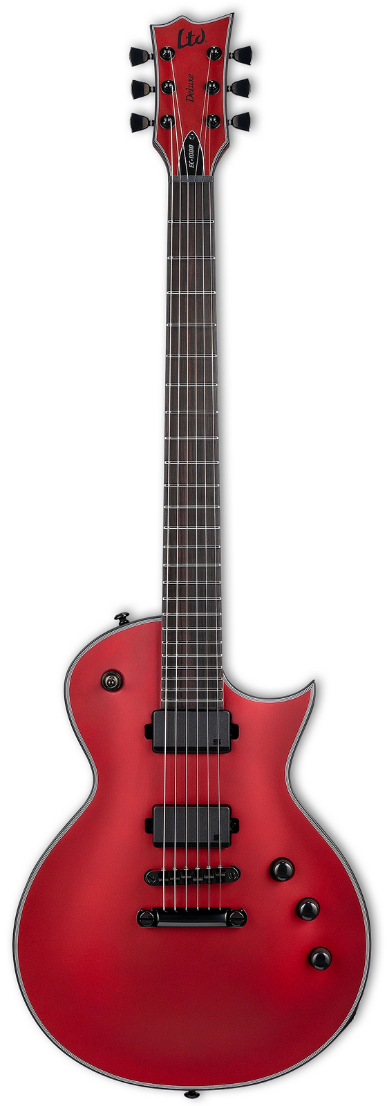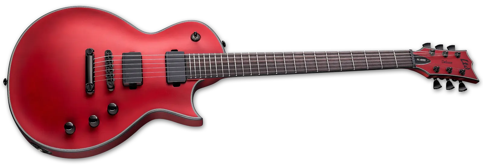 Designed for professional guitar players who require the versatile tones, smooth playability, and complete reliability for serious recording and touring needs, the EC-1000 Candy Apple Red Satin is a single-cutaway guitar that stands out from the crowd. Built with set-thru construction at traditional 24.75” scale, it offers unobstructed access to the highest frets. This EC-1000 includes a mahogany body, a three-piece mahogany neck, a matching-finish headstock, and a Macassar ebony fingerboard with 24 extra-jumbo stainless steel frets. Black and white multi-binding defines the body and headstock. Components on the EC-1000 Candy Apple Red Satin include a TonePros locking TOM-style bridge and tailpiece, LTD locking tuners, and a set of direct-mounted Seymour Duncan Mortal Coil 3-Voice Active Humbucker pickups, with push-pull controls to activate their multiple voices.