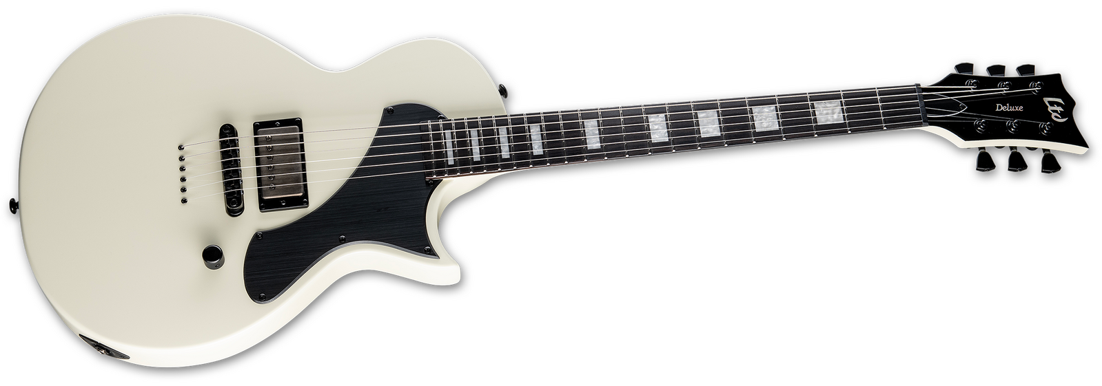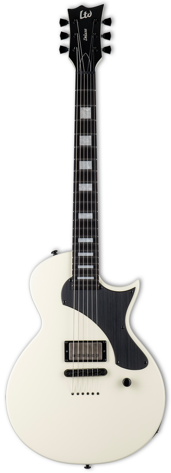 At first glance, the LTD Deluxe EC-01FT appears to be a simple, streamlined take on the single-cutaway ESP Eclipse design, but on closer examination, this guitar has some serious refinements that make it one of the very best choices for players seeking the most hardcore performances imaginable. With its flat-top body and clean electronics layout, there’s nothing to get in the way of everything from intense riffs and huge sizzling power chords to melodic lead lines. It features a comfortable 24.75” scale with a smooth set-thru heel construction, so there’s nothing to impede you as you grab the highest frets. It provides a classic mahogany body and three-piece mahogany neck to prioritize huge tones, and adds a distinctive brushed matte black pickguard to let you stand out from the crowd. The EC-01FT provides a 43mm nut, giving you a touch more fretboard in your hand for big power chords. It features a Macassar ebony fingerboard with pearloid block inlays and 22 extra-jumbo stainless steel frets. A recessed TonePros TOM bridge and string thru body keeps your string height low and comfortable while maximizing resonance. LTD locking tuners keep you in tune and make string changes a breeze. Perhaps the biggest advantage of the EC-01FT is the Custom 14, a new custom pickup designed exclusively for ESP by Seymour Duncan. Purpose-built to cover the specific needs of the ESP player, the EC-01FT’s flexible and dynamic Custom 14 pickup offers everything you need, ranging from clean, chimey intros to sizzling rock, classic metal, and hardcore tones… and the most crushing modern chugging and articulate, angular rhythm lines you ever hoped for. A push-pull control on the volume knob splits this pickup to the most wide-ranging single coil bridge territory we've ever offered.