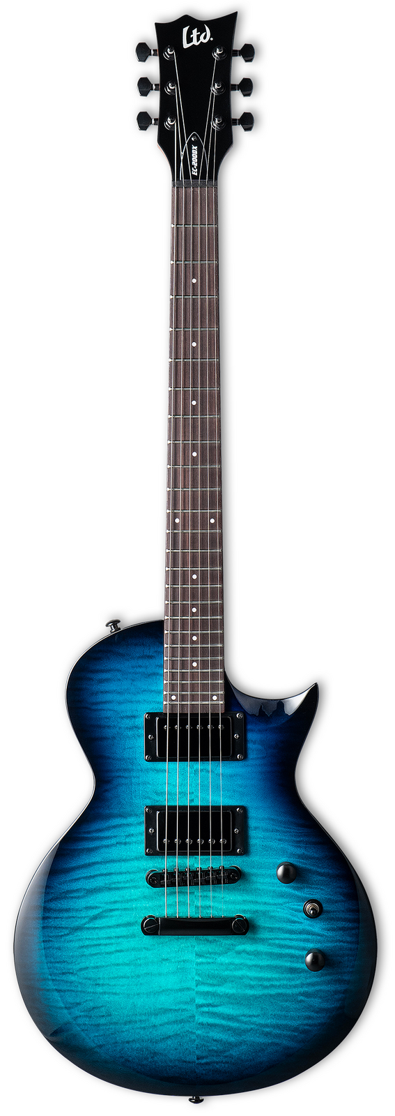 LTD’s DX range allows for musicians to get access to a high-quality guitar at a price far less than its impressive features would imply. The EC-200DX offers a flat-top single-cutaway Eclipse body with a bevelled edge. It’s built with bolt-on construction at 24.75” scale, featuring a very comfortable poplar body with a flamed maple top, and a roasted maple neck with a rosewood fingerboard. This guitar includes a TOM-style bridge and tailpiece, 24 extra-jumbo frets, dot inlays, and black chrome hardware. The EC-200DX includes a set of our acclaimed ESP LH-150 humbucking pickups with matching black chrome covers in the bridge and neck positions, providing punchy, great tone for all genres of music. You also get the flexibility of single-coil tones controlled by a push-pull switch on the tone knob.