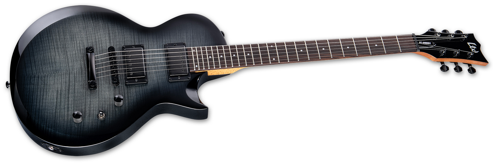 LTD’s DX range allows for musicians to get access to a high-quality guitar at a price far less than its impressive features would imply. The EC-200DX offers a flat-top single-cutaway Eclipse body with a bevelled edge. It’s built with bolt-on construction at 24.75” scale, featuring a very comfortable poplar body with a flamed maple top, and a roasted maple neck with a rosewood fingerboard. This guitar includes a TOM-style bridge and tailpiece, 24 extra-jumbo frets, dot inlays, and black chrome hardware. The EC-200DX includes a set of our acclaimed ESP LH-150 humbucking pickups with matching black chrome covers in the bridge and neck positions, providing punchy, great tone for all genres of music. You also get the flexibility of single-coil tones controlled by a push-pull switch on the tone knob.