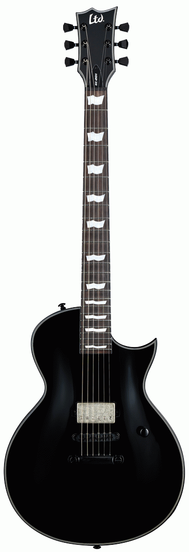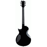 The LTD EC-201 in a sleek gloss Black finish is a stylish and high-performing guitar, designed for rock and metal enthusiasts. It features multi-ply binding on the mahogany body and headstock, along with black binding on the rosewood fingerboard, adding a refined and premium look to the instrument.