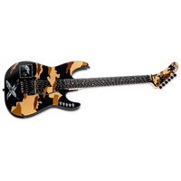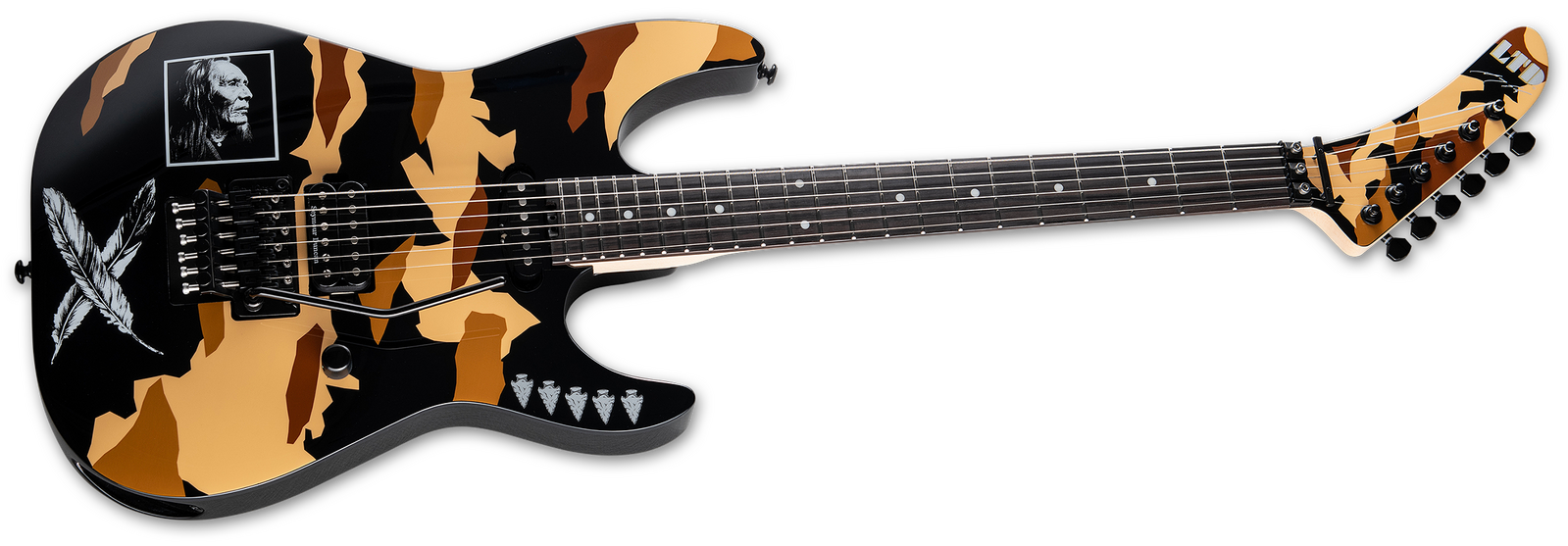 George Lynch is one of the world’s most respected and influential guitarists, and was the very first ESP Signature artist to join our company back in the 1980s. The LTD GL Desert Eagle is a re-imagining of his famous Kamikaze model, now thematically focused on Native American images and colors. It features an alder body and maple neck, joined with bolt-on construction at 25.5” scale. The Kamikaze’s kanji characters and bombs have been replaced by double feathers and arrow heads in this striking design, which offers subtle black binding on the body. Its neck profile implements George’s original U shape, and it includes a Macassar ebony fingerboard, dot position markers, and 22 extra-jumbo stainless steel frets. Components on the LTD GL Desert Eagle include a Floyd Rose 1000 SE double-locking tremolo with stainless steel screws, a special low-friction volume pot, and a special pickup combination that includes a Seymour Duncan Distortion pickup in the bridge, with push-pull pickup select on the single volume knob, and an ESP SS-120 single-coil in the neck position. A portion of the proceeds of every LTD Desert Eagle will be contributed to George’s non-profit charity that assists Native American communities and causes. Includes deluxe ESP hardshell case.