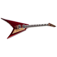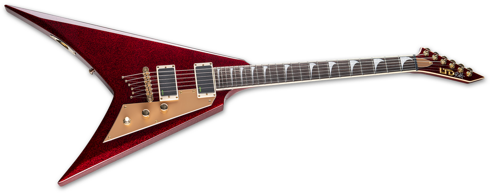 As the lead guitarist for Metallica, the biggest heavy metal band of all time, Kirk Hammett has inspired generations of musicians over the past 40+ years. Kirk’s solos are a crucial part of Metallica’s dominating sound, and he has relied on ESP for decades to make guitars that meet his every need. The LTD KH-V is the newest addition to the Kirk Hammett Signature Series. It’s available in three different versions: Black Sparkle with black hardware and black pickguard; Red Sparkle with gold hardware and gold pickguard; and Metallic Gold with gold hardware and cream pickguard. The KH-V offers neck-thru-body construction, with an extra-thin U-shaped three-piece maple neck and korina body at 25.5” scale. Its Macassar ebony fingerboard features pearloid wave inlays and 24 extra-jumbo frets. The sound of the KH-V is powered by a set of Kirk’s signature EMG Bone Breaker pickups, with the BB-B ceramic bridge and the BB-N alnico 5 neck pickups for crisp, crushing leads or smooth, rounded rhythm tones at the flip of a switch. Controls of the KH-V include volume, tone, and a three-way pickup selector toggle. Other pro features include a TonePros bridge with string-thru-body and LTD locking tuners. Includes ESP deluxe hardshell case.