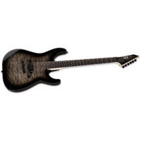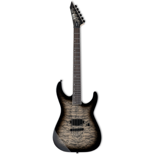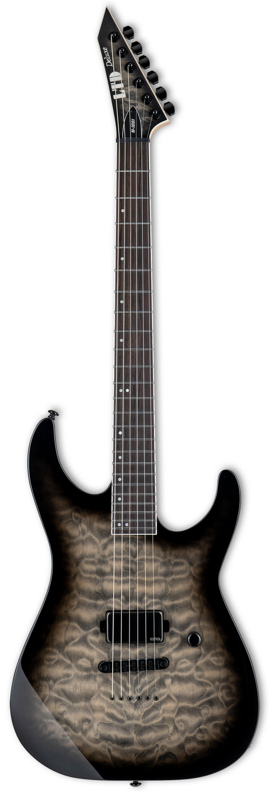 Guitars in the LTD 1000 Series are designed to offer the tone, feel, looks, and quality that working professional musicians need in an instrument. If you want the speedy, high-performance abilities of the M Series in a guitar with special appointments that will let you stand out in a crowded field, the M-1001NT is for you. This guitar adds an amazing quilted maple top over its alder body, finished in transparent Charcoal Burst that allows the figured wood to grab the spotlight. More than just a great looking guitar, the M-1001NT offers performance features like its extra-thin U-shaped maple neck, and a compound neck radius for maximum speed and comfort. The Macassar ebony fingerboard features 24 extra-jumbo frets and offset mother-of-pearl dot inlays. Its reverse headstock has a matching finish in quilted maple, and white binding on the neck and headstock. Components on the M-1001NT include LTD locking tuners, a TonePros locking TOM bridge with string-thru-body, and a single aggressive direct-mount EMG 81TW with push-pull control for coil splitting.
