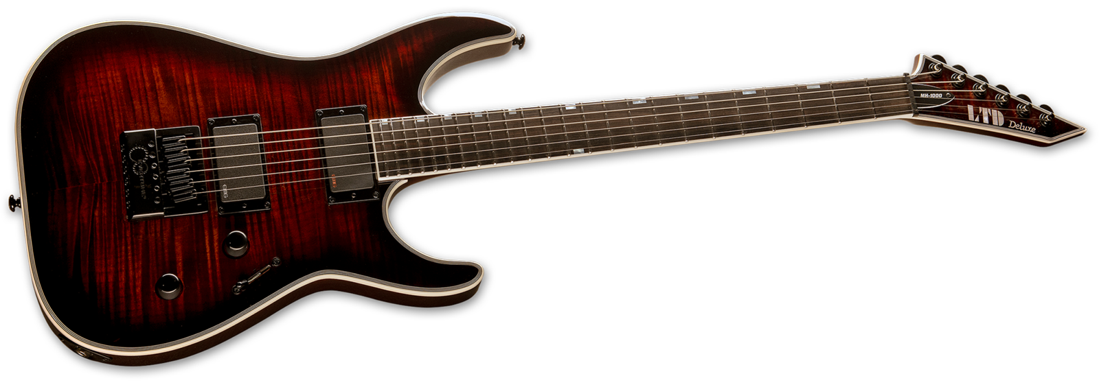 LTD Deluxe guitars are designed to offer the tone, feel, looks, and quality that working professional musicians require in an instrument, while remaining affordable enough for serious players. The LTD MH-1000 EverTune Dark Brown Sunburst is an outstanding instrument with a mahogany body and flamed maple top, and multi-binding on the body and matching-finish headstock. Its Macassar ebony fingerboard has 24 extra-jumbo stainless steel frets. This MH-1000 model features the EverTune constant tension bridge, keeping your guitar in tune at all points of the fingerboard in nearly any environment. Other components include Grover tuners, and a set of EMG 60TW-R and EMG 81 active pickups, with a push-pull control to split the neck pickup.
