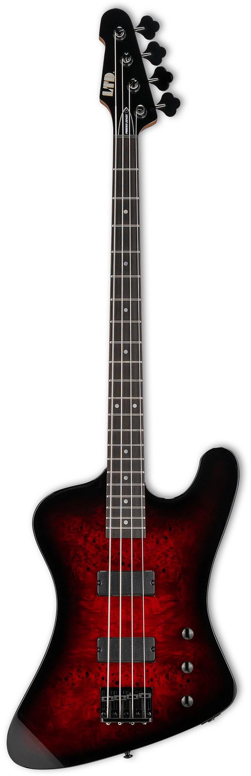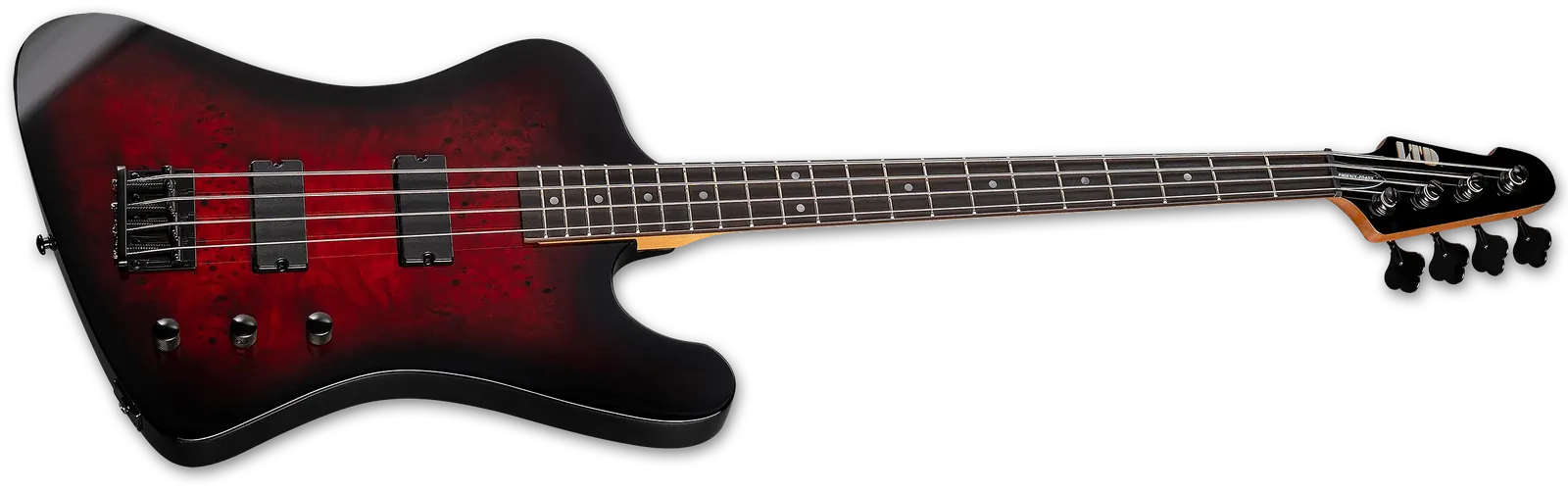 The LTD Phoenix-204DX takes the flowing curves of the Phoenix shape and delivers it in a powerful bass that’s priced to fit the budgets of most musicians. It features bolt-on construction at 34” scale, with a poplar body topped by burled poplar where the natural knots and figured grain offers a terrific aesthetic look. This bass also offers a smooth and comfortable thin U-shaped roasted maple neck and a rosewood fingerboard with dot inlays and 21 extra-jumbo frets, as well as a reverse headstock. Components on the B-204DX include black hardware, LTD vintage tuners, an LTD DB-4 fixed bridge, controls for volume, balance, and tone boost, and a set of excellent ESP SB-4 bridge and neck pickups.