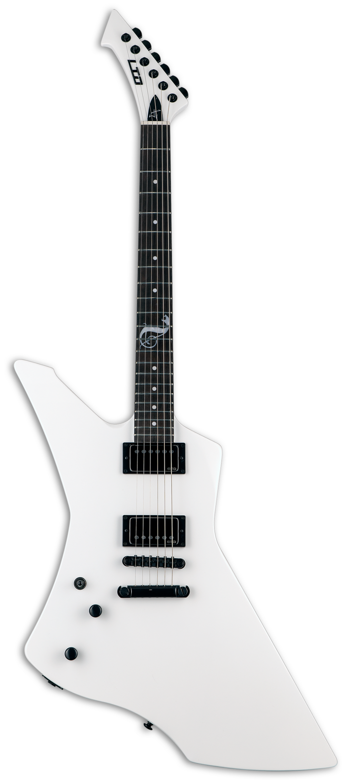 The LTD Snakebyte is a Signature Series model of James Hetfield, the frontman of Metallica and one of the world's most highly respected rhythm guitar players in any genre. The Snakebyte was created based on James' own original design. It features set-neck construction at 24.75" scale, with a mahogany body and a three-piece mahogany neck with ebony fingerboard and 22 extra-jumbo frets with a snake inlay at the 12th fret. The LTD Snakebyte is powered by James' own EMG JH SET active pickups, and includes a TonePros locking TOM bridge and tailpiece. Available in Snow White and Black Satin finishes.