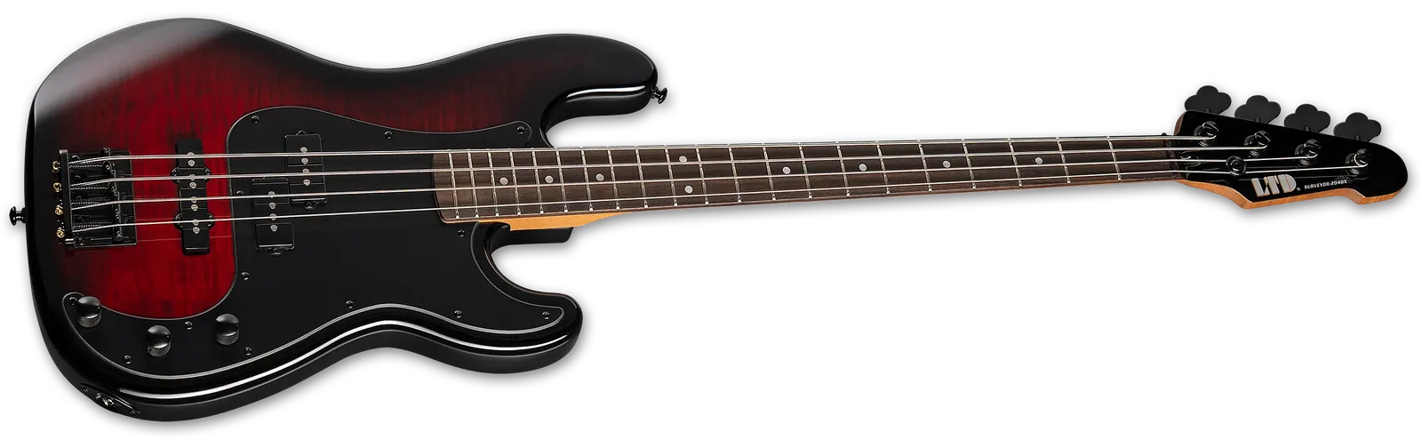 The LTD Surveyor-204DX takes a classic ESP bass shape and offers it with great LTD quality and high value. Built with bolt-on construction at 34” scale, the Surveyor-204DX includes a lightweight, resonant poplar body with a burled poplar top, imparting a superbly unique look with the knots and figured wood grain showing through the transparent finish. It features a smooth and comfortable roasted maple neck with rosewood fingerboard, dot inlays, and 21 extra-jumbo frets. Components on the Surveyor-204DX include black hardware, LTD vintage tuners, an LTD DB-4 fixed bridge, controls for volume, balance, and tone boost, and a set of ESP LJB (bridge) and LPD (neck) pickups.