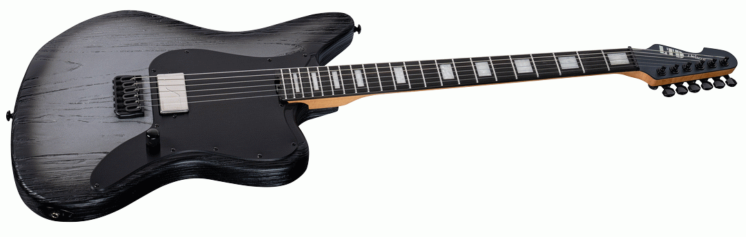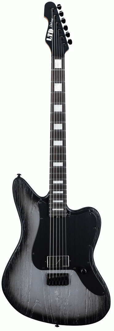The LTD Deluxe XJ-1 Baritone, in a bold Silver Blast finish, features bolt-on construction at a 27” baritone scale, making it ideal for extended range and down-tuned playing. Its sandblasted swamp ash body provides both a unique textured appearance and rich tonal resonance.
