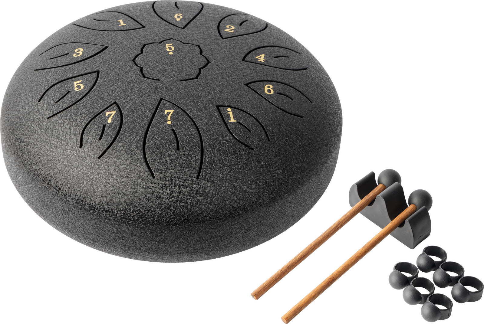Supplied with mallets, mallet holder, six rubber finger pads, instructional song booklet and velvet draw-string carry bag