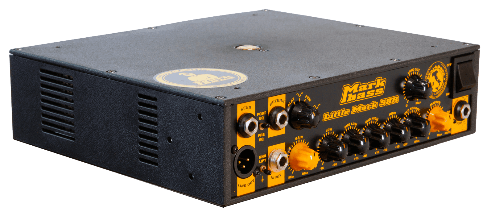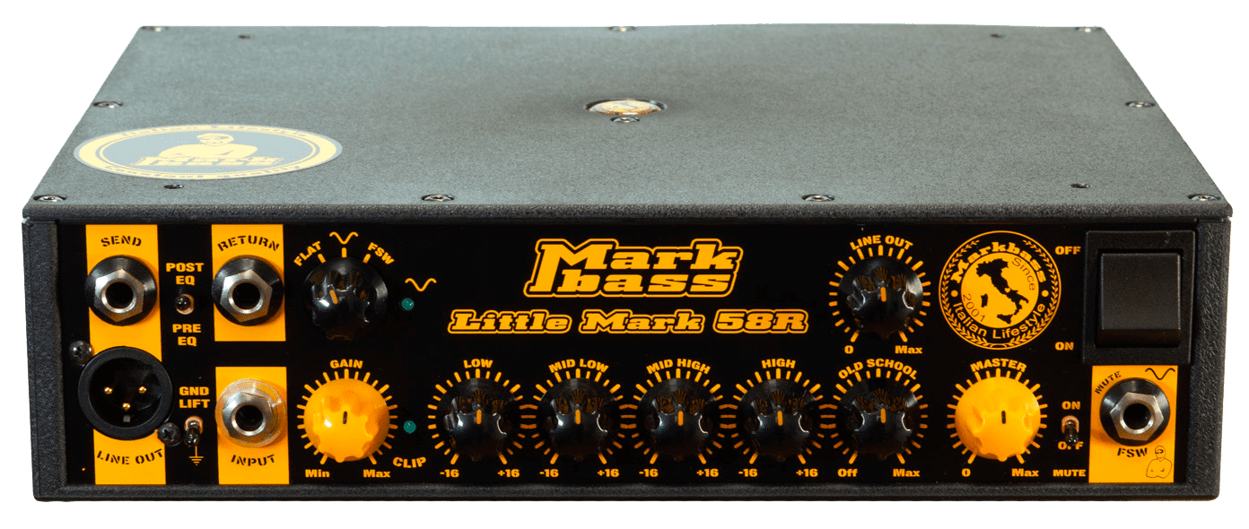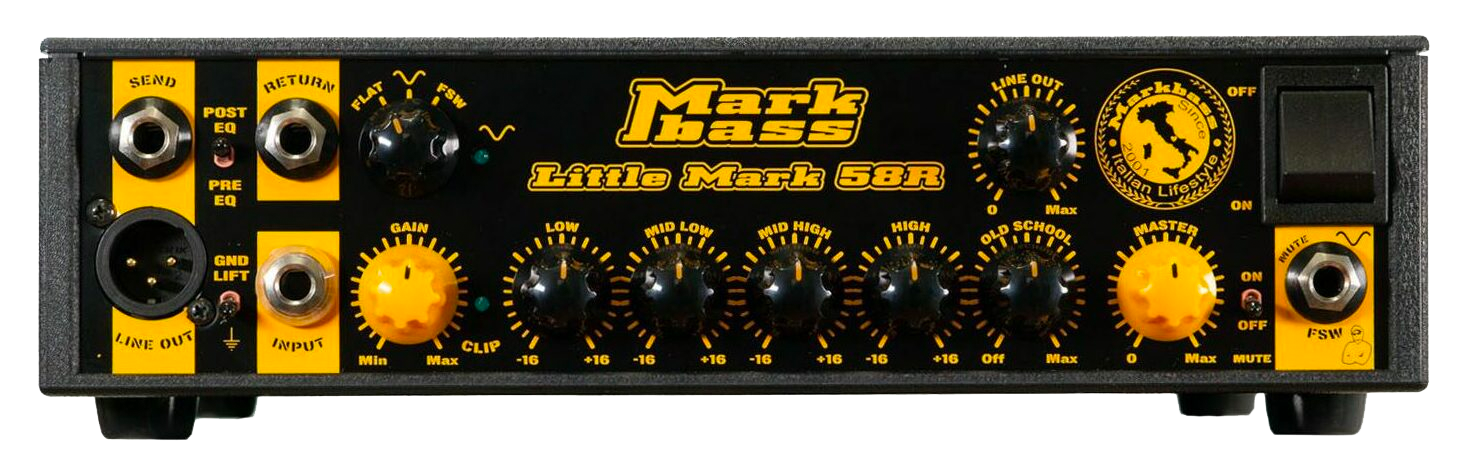 The new LITTLE MARK 58R amp new design features all the connections and controls on the front panel leaving on the rear panel only the speaker outs and AC power socket, offering optimal ergonomics and making everything more practical. This amp features updated 4 band EQ section, the new bi-band limiter paired with a 500 watt MPT power amp, a mute switch, and the 3 way rotary-switch that that includes the options of a Flat, Scooped or FSW (Footswitchable) EQ options, all in an high build quality and ultralight new chassis in ABS (V0), a super portable package that weights only 2Kg/4.41lbs.