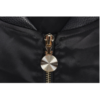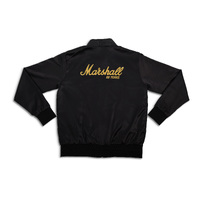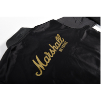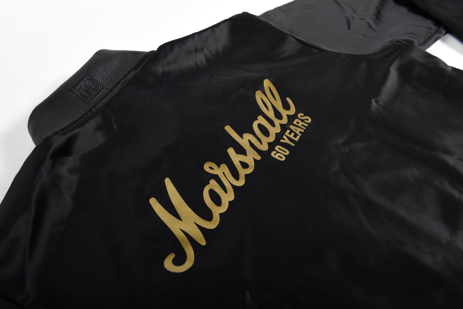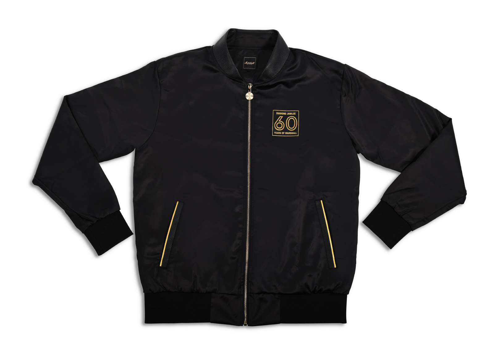 Introducing the anniversary satin bomber jacket. In honour of Jim Marshall, who wore countless bomber jackets throughput his years of loud. Made from satin tri-blend fabric with a levant leather collar and pockets, a debossed 60th anniversary logo on the collar, and a gold metal zip with Marshall dial sandblasted zip puller, this jacket is one way to truly celebrate 60 years of Marshall.