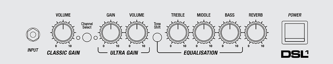 Classic gain channel with volume, ultra gain channel with gain and volume control, channel select switch, tone shift switch, treble, middle, bass, reverb and power reduction option