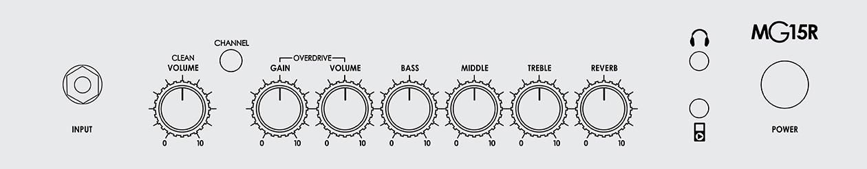 Clean volume, Channel select button, Overdrive Gain Overdrive, Volume, Bass, Middle, Treble, Reverb