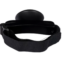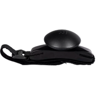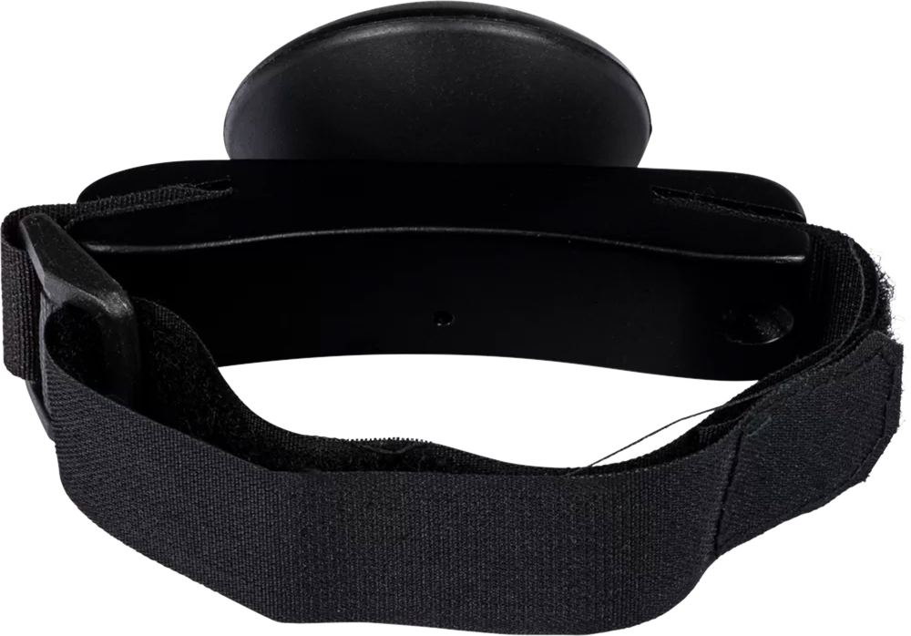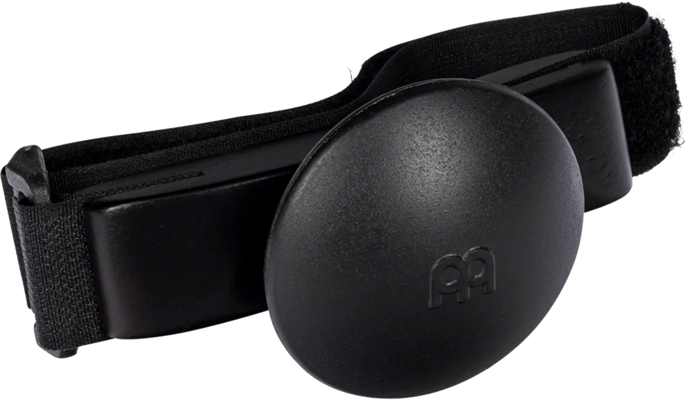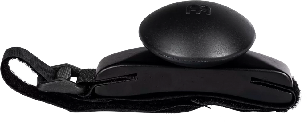 The shaker is placed at an angle on the strap to produce a short, controlled sound.