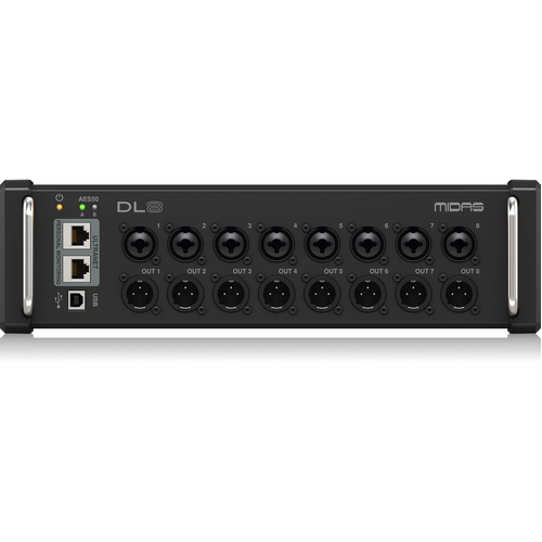 The DL8 Stage Box provides 8 of the award-winning Midas PRO microphone preamplifiers with switchable +48 V phantom power; 8 electronically balanced low impedance line level; integrated ULTRANET distribution hub for connecting to Behringer P16-M personal monitor mixers or Turbosound speaker systems; plus dual AES50 SuperMAC ports for cascading additional stageboxes.