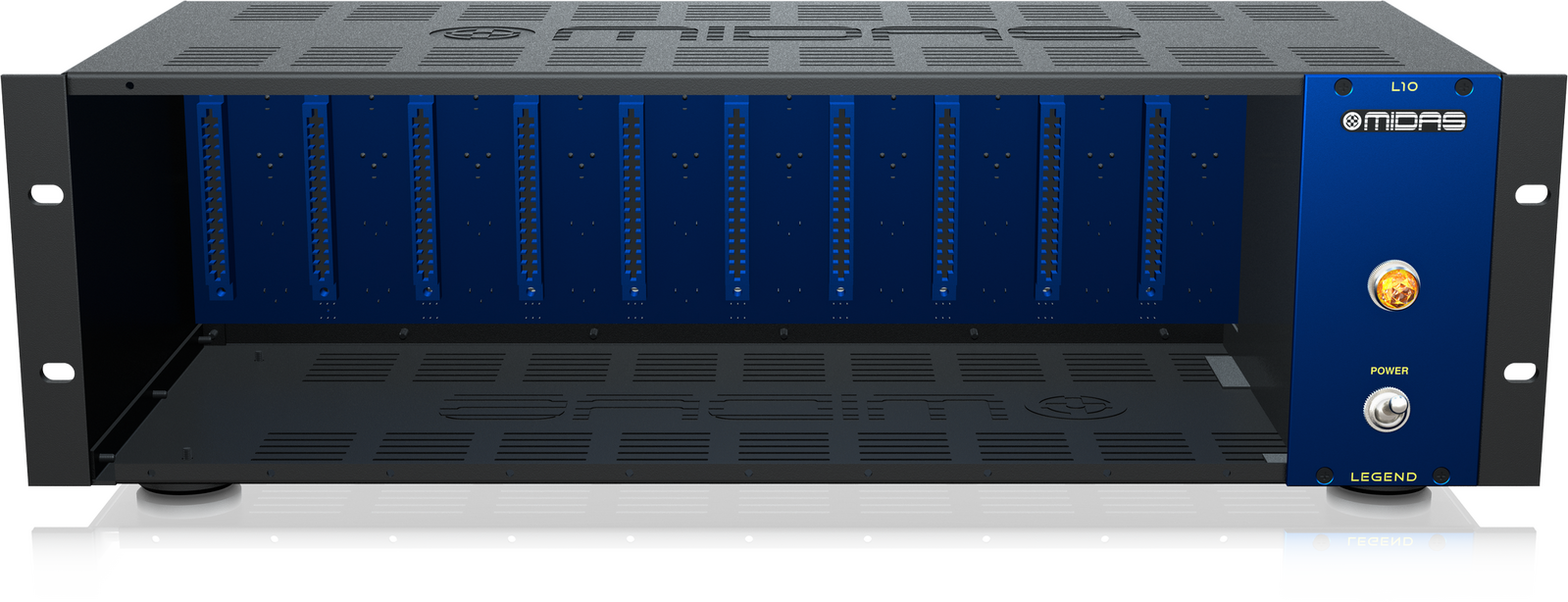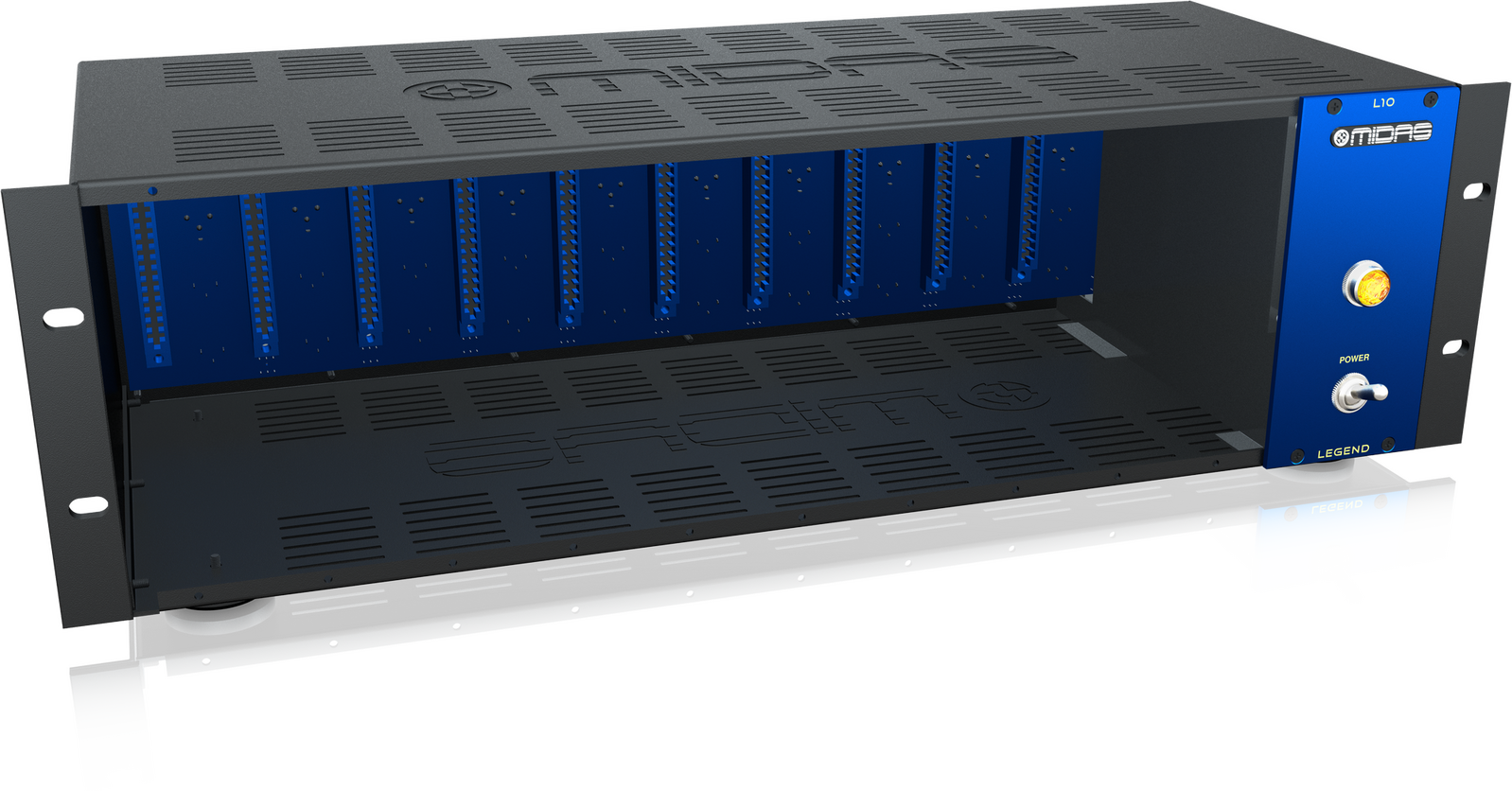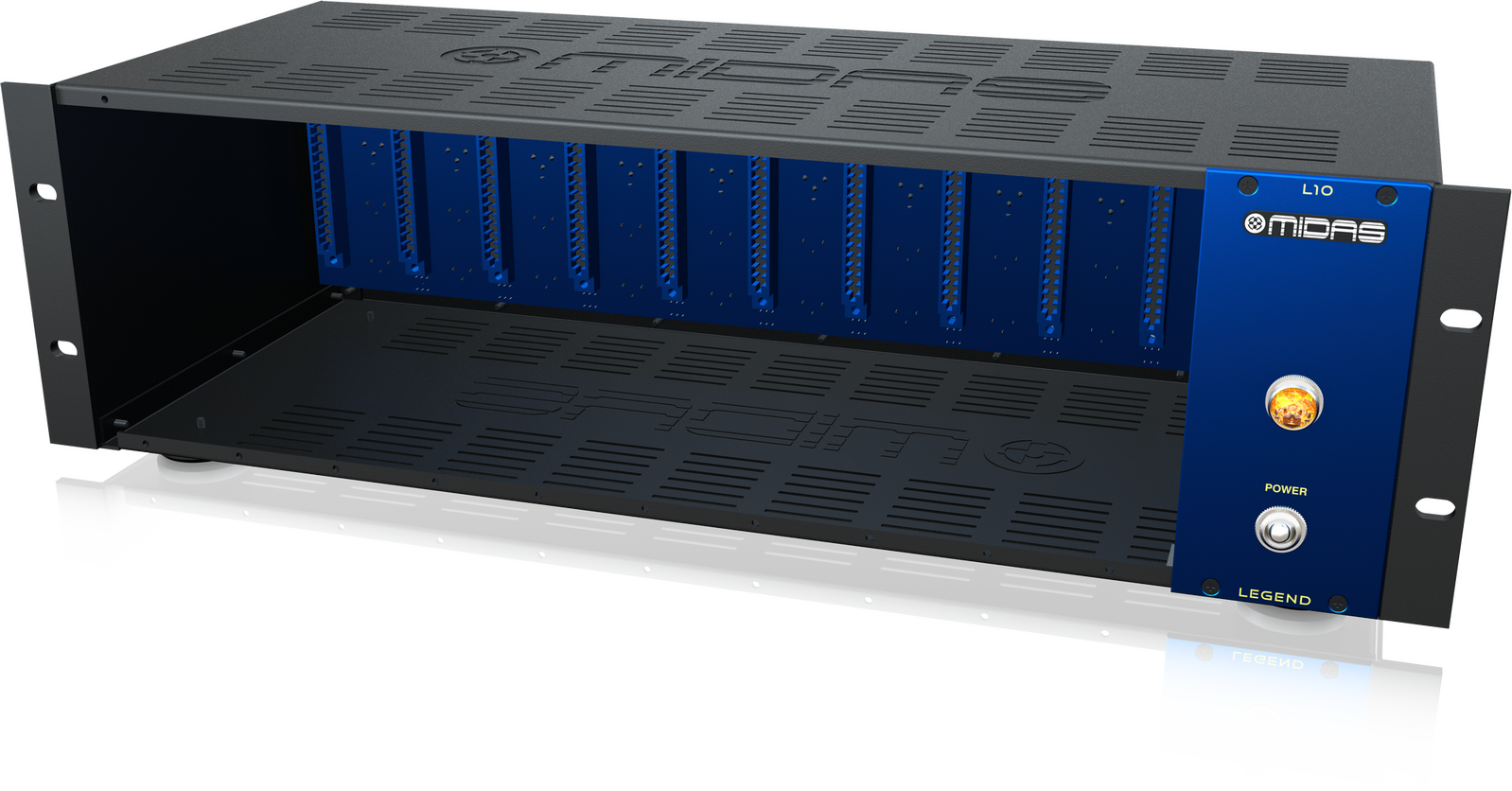 The L10 chassis provides I/O connectivity and +48 V phantom power for up to 10 processing modules in a rugged steel cabinet that occupies only three 19" rackspaces.
