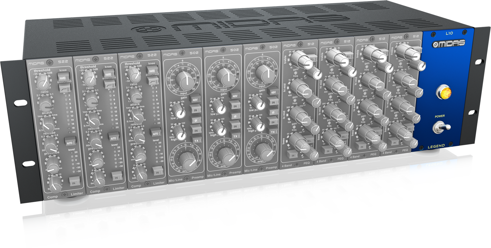 The LEGEND L10 500 Series Rackmount Chassis lets you mix and match a wide range of audio processing modules to build the ideal signal chain for any application. With space for up to 10 single-width modules, advanced audio routing for simplified cabling, and a robust auto-ranging universal switch-mode power supply, you can take your favourite modules anywhere in the world with complete confidence. Designed to accommodate all 500 series-compatible modules and plug-in cards, the L10 is the perfect companion for your MICROPHONE PREAMPLIFIER 502, COMPRESSOR LIMITER 522, PARAMETRIC EQUALISER 512, and the many other modules currently under development – as well as those from 3rd party vendors.