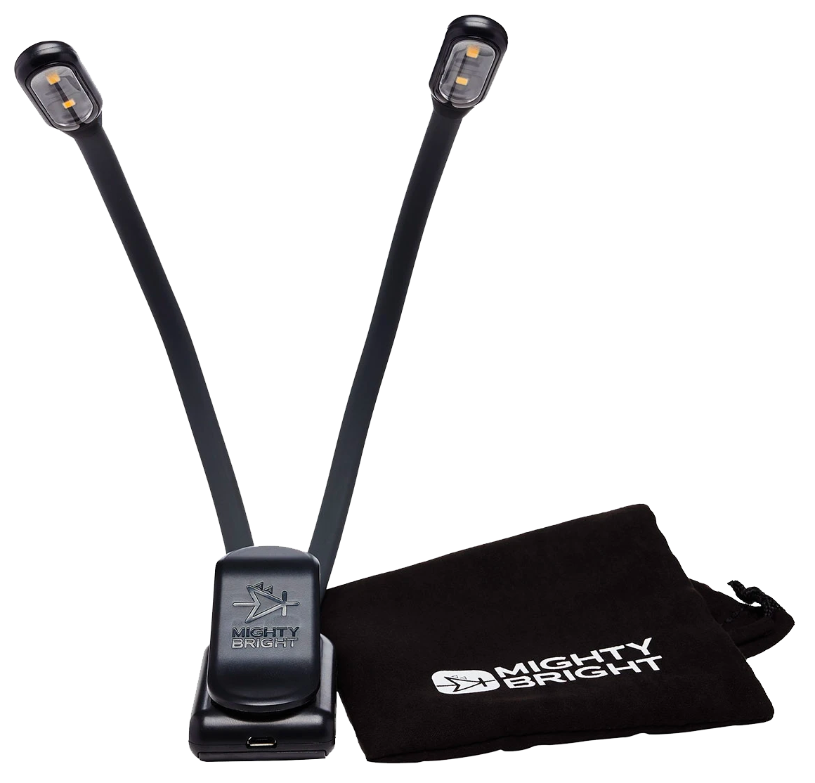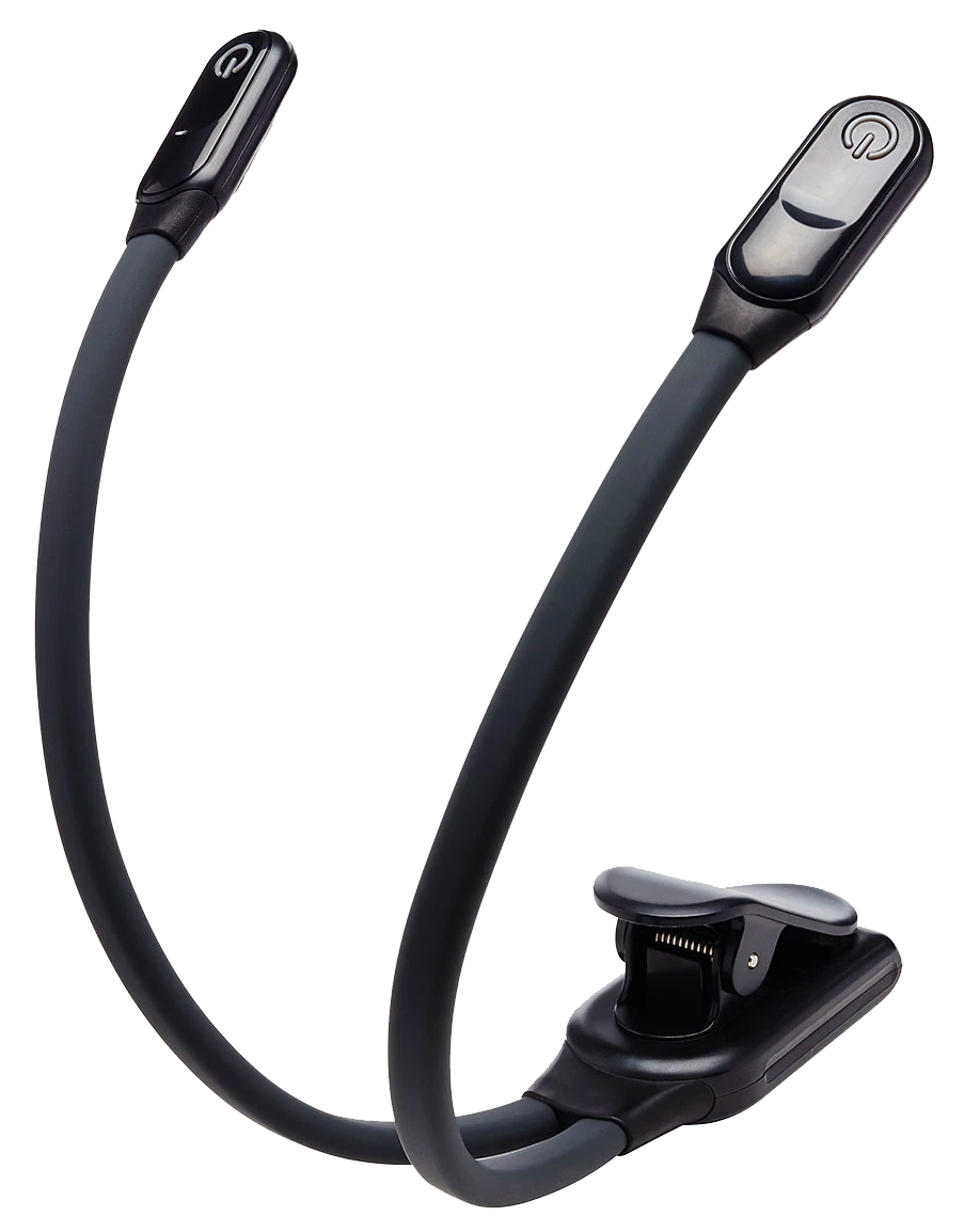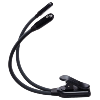 The DuoFlex is a black, 4-LED reading light with 2 LED’s on the end of each of 2 adjustable arms with integrated clip. It is an ideal reading light for attaching to a music stand in low-light environments. The DuoFlex is powerable by the included micro-USB cable and any USB charger, or 3 x AAA batteries.