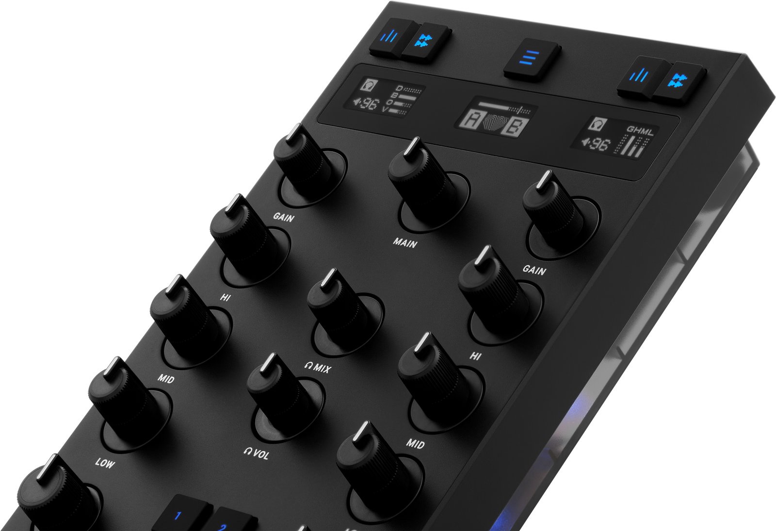 Spend less time looking at your laptop with OLED displays that show essential mixing information, EQ and stem parameters, Mixer FX selection, and master output meter.